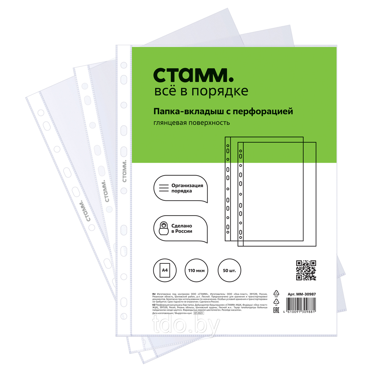 Папка-вкладыш с перфорацией «СТАММ» отлично подойдет хранения и систематизации документов. Папка размером 310*240 мм изготовлена из полипропилена толщиной 110 мкм. Папка вмещает до 50 листов. Имеет глянцевую текстуру, защищает листы от внешних воздействий. Перфорация на боковой части позволяет разместить изделие в папке с любым кольцевым механизмом или скоросшивателе. Упакованы в пакет по 50 штук.