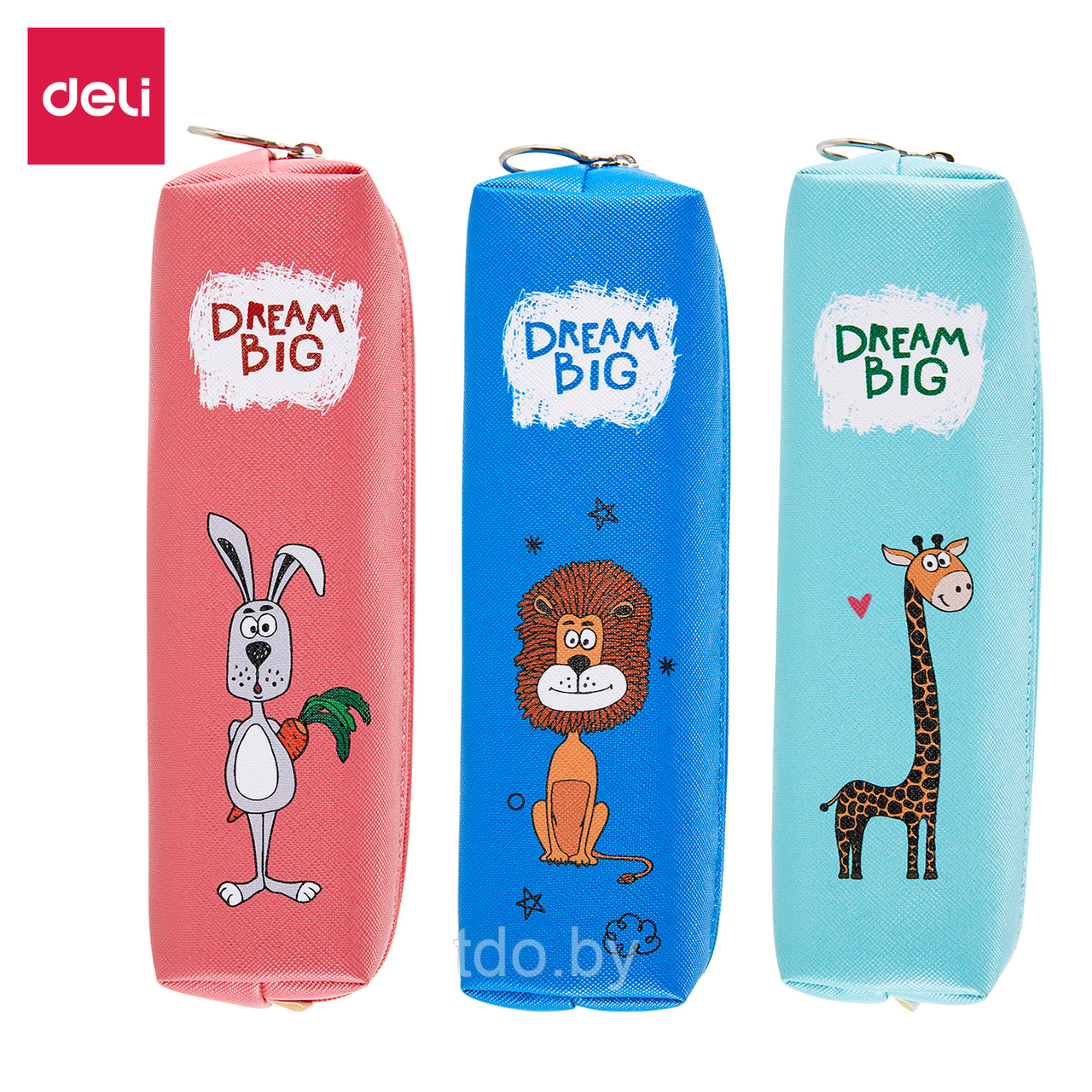 Пенал DELI на молнии подойдет для школьников. Представлен в трех цветах: голубом, синем и розовом с изображением животных. Пенал имеет одно отделение.