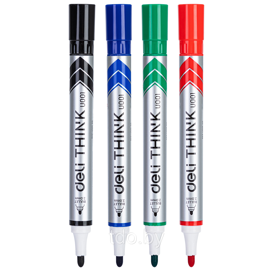 Набор маркеров для белой доски Deli THINK, 4 цвета, пишут ярко и четко на магнитно-маркерных досках, стекле и гладких поверхностях, легко стираются, не оставляя разводов и следов. В упаковке 4 цвета: красный, зеленый, синий, черный.