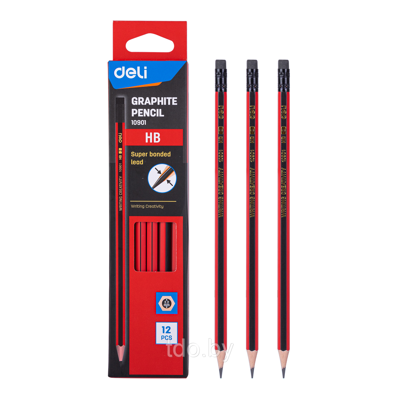 Карандаш чернографитный DELI, HB, шестигранный, заточенный, с ластиком, красно-черный корпус, деревянный