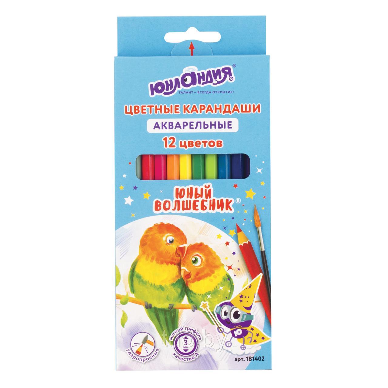 Карандаши цветные акварельные ЮНЛАНДИЯ "ЮНЫЙ ВОЛШЕБНИК", 12 цветов, шестигранные, грифель 3 мм